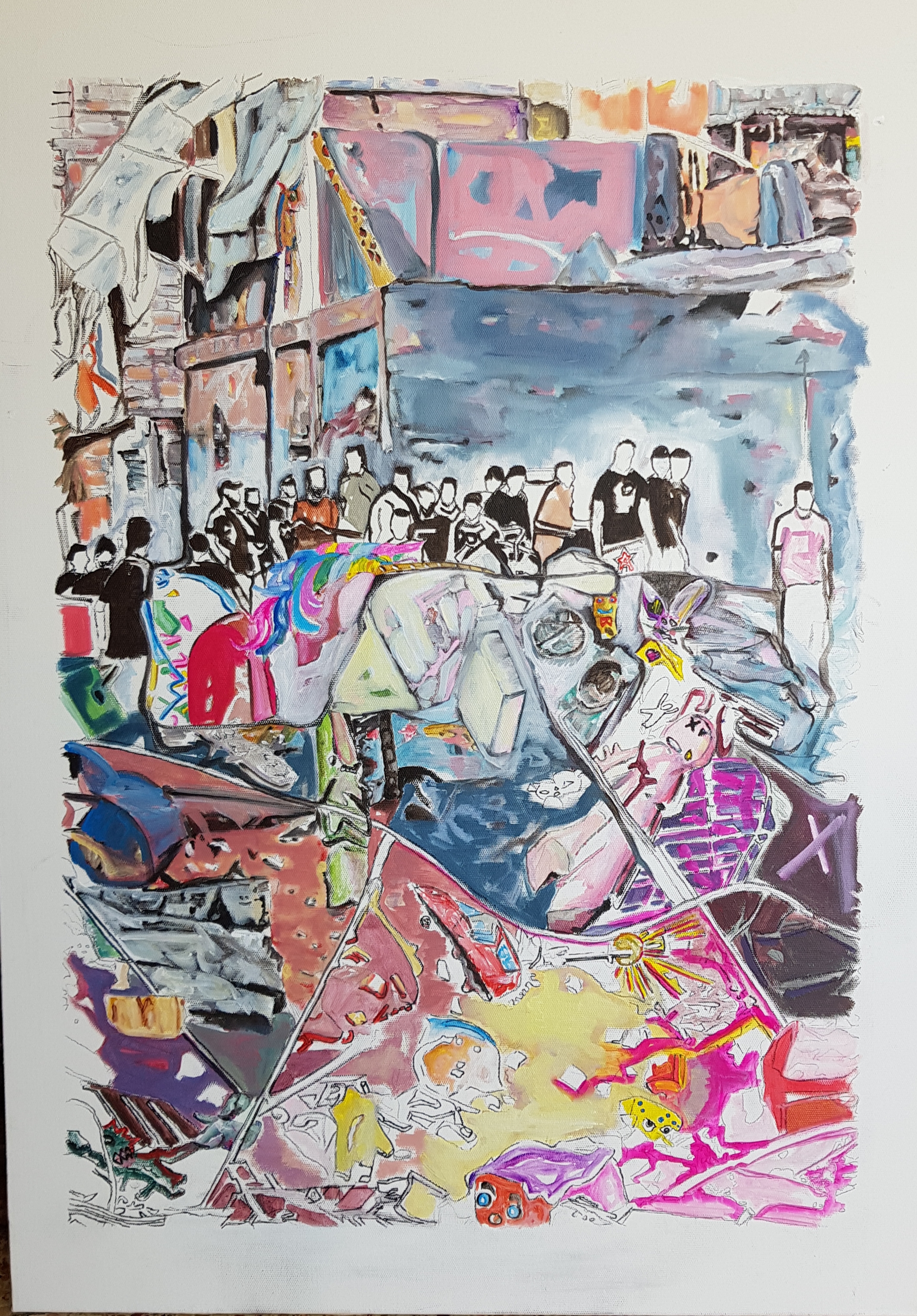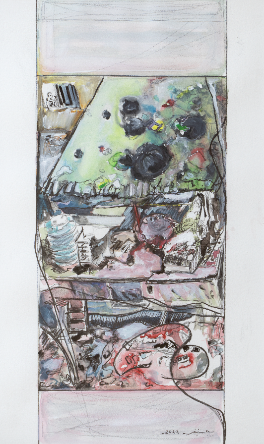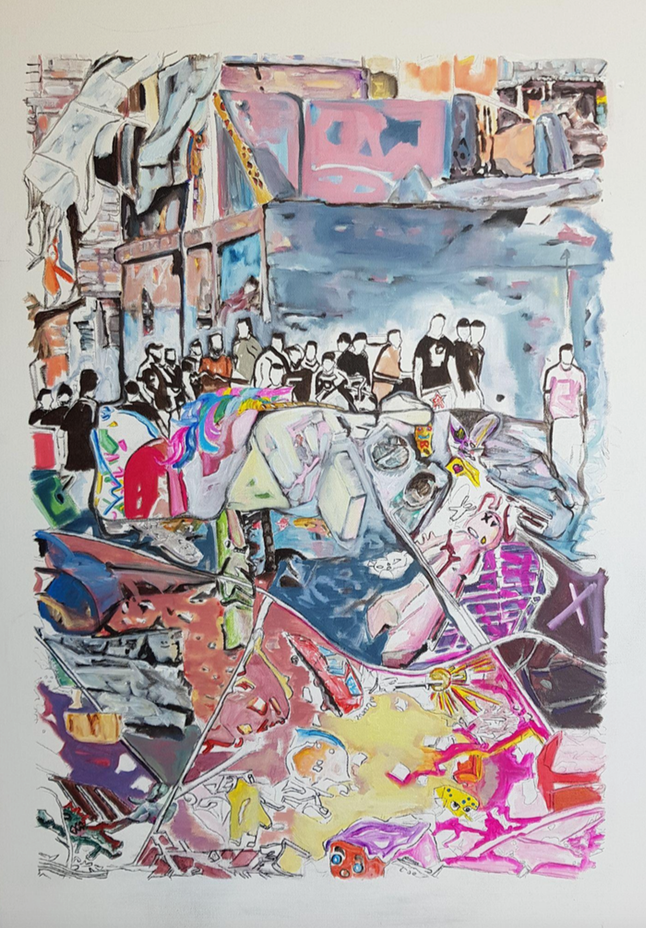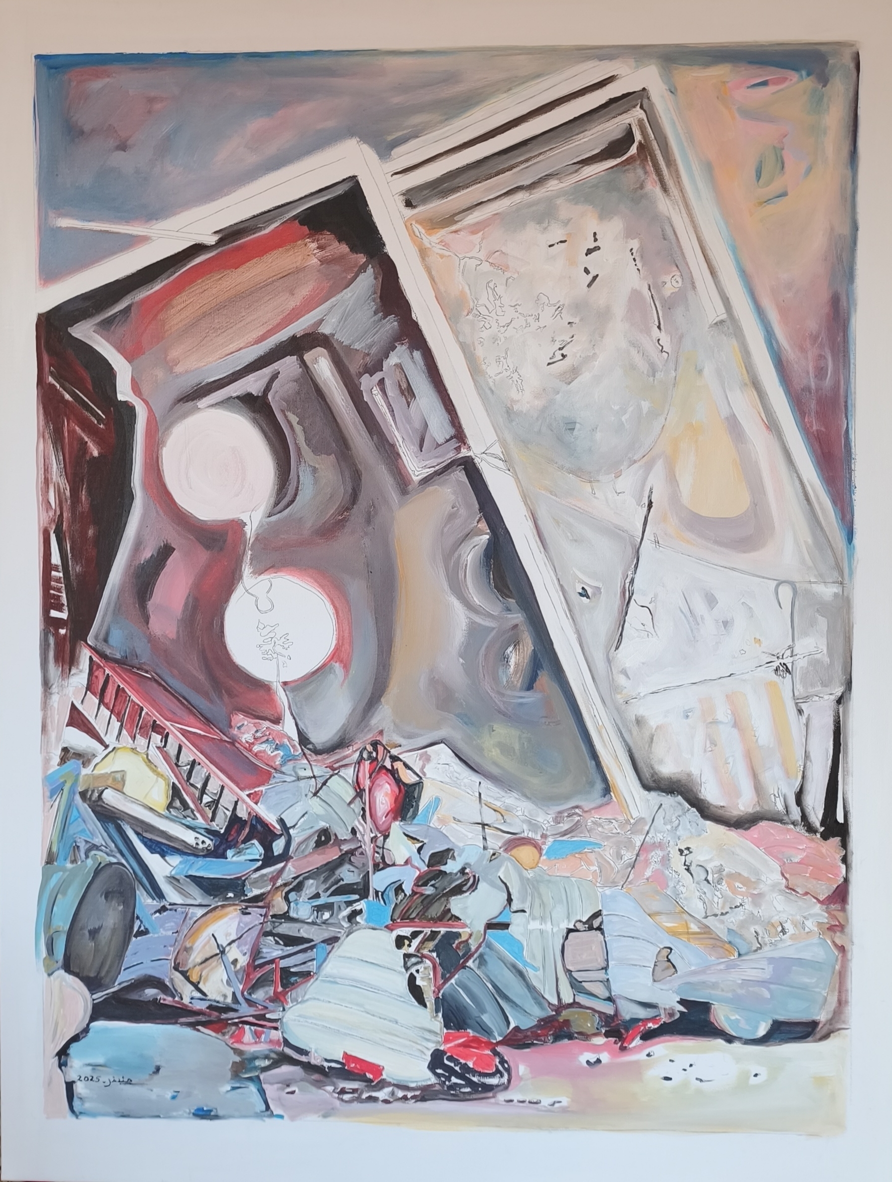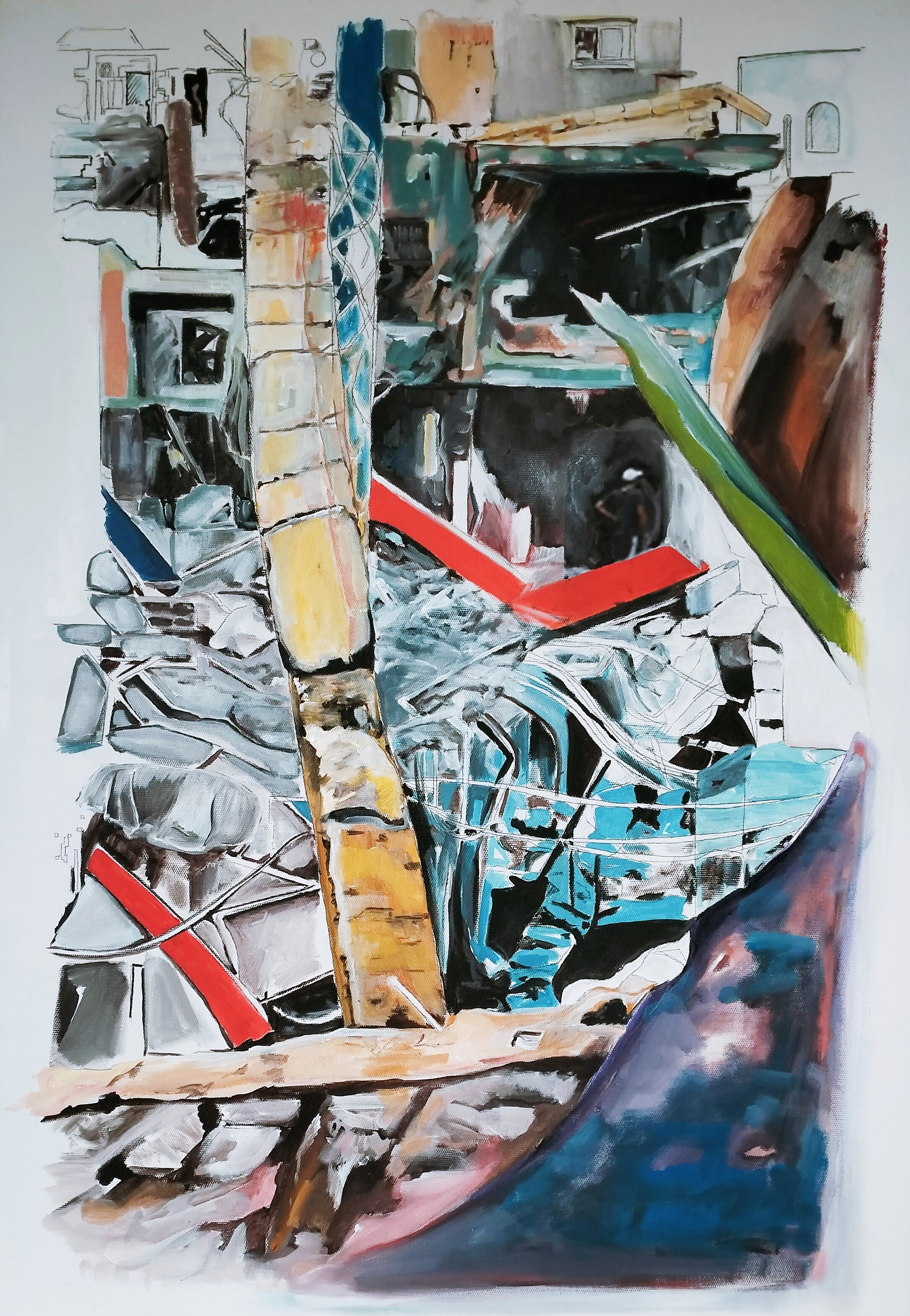 Working across painting and image-making, Haddad engages the psychological and spatial traces left by systems of power and marginalization. Her work draws on fragmentation, displacement, and post-traumatic imagery, constructing dense visual fields where personal experience and collective conditions intersect.